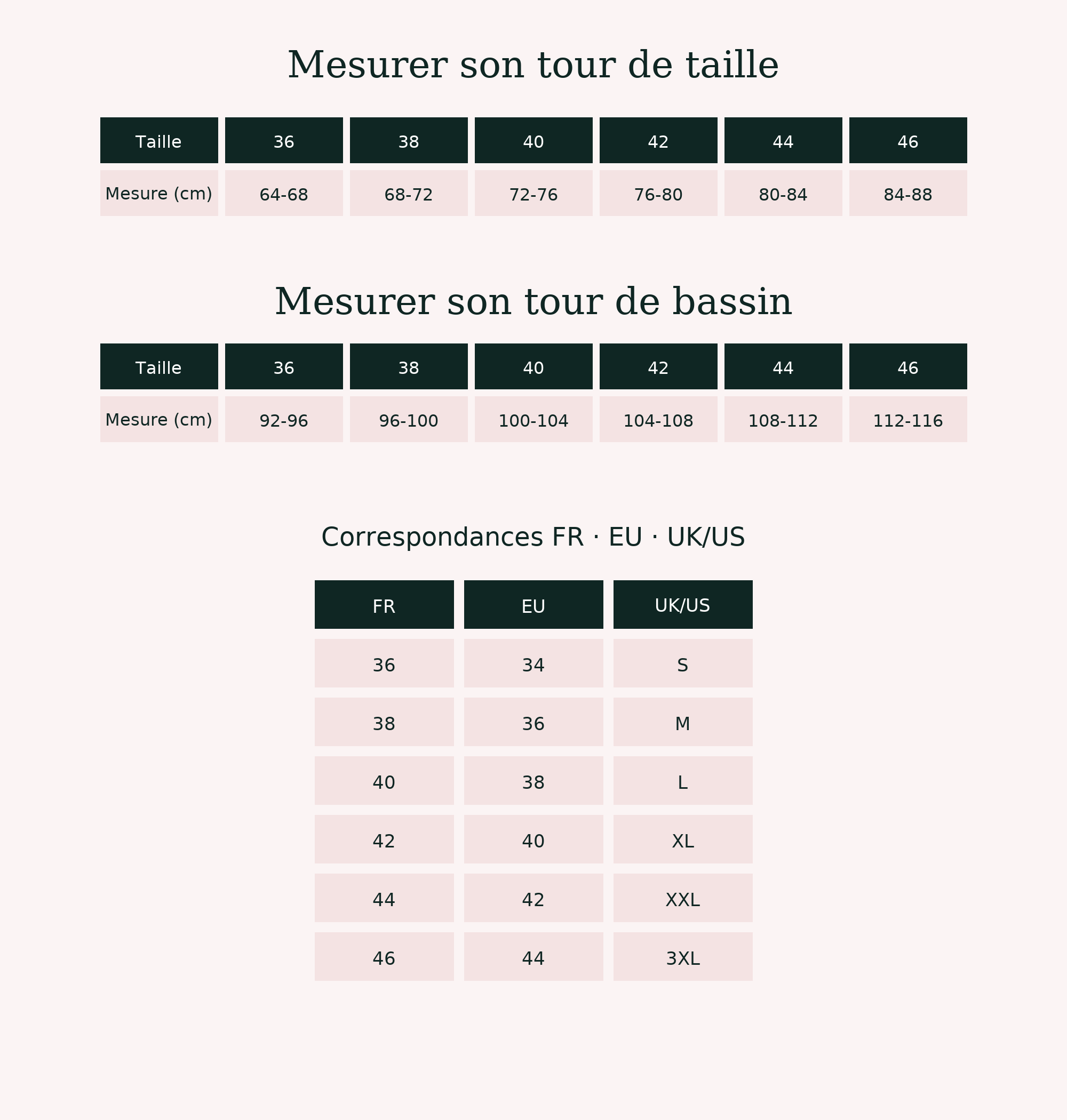 Nous avons fait le choix de ne mentionner que le tour de de taille (utile pour l'achat de porte-jarretelles ou de culottes taille haute) et le tour de bassin (utile pour les culottes, strings, tangas, etc).
