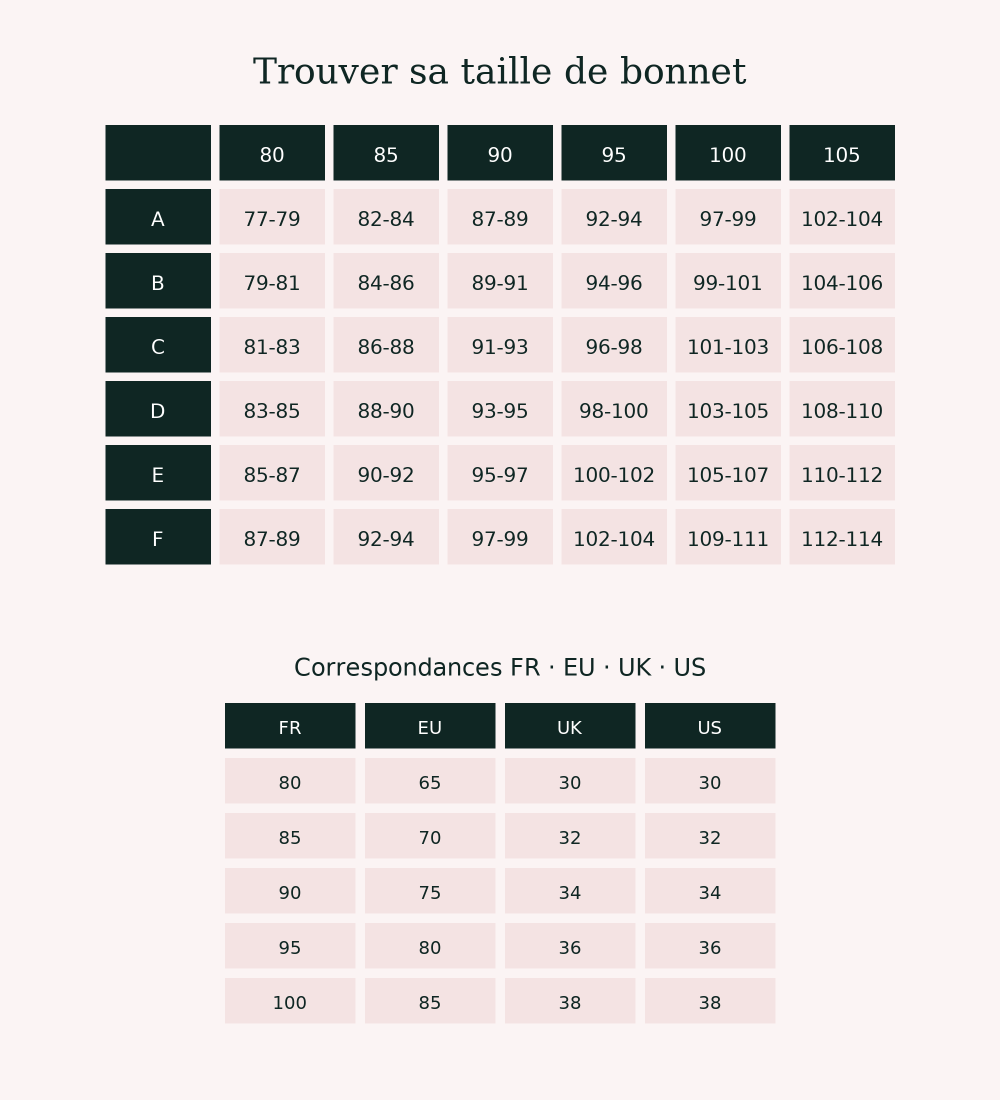 Les valeurs dans les cases roses correspondent à votre tour de poitrine en cm.